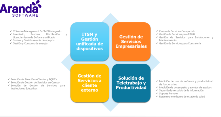 En Aranda Software desarrollamos soluciones para la Gestión de Servicios e Infraestructura de TI, alineadas a las mejores prácticas ITIL® y enfocadas en generar el mayor valor para las compañías del mercado latinoamericano.